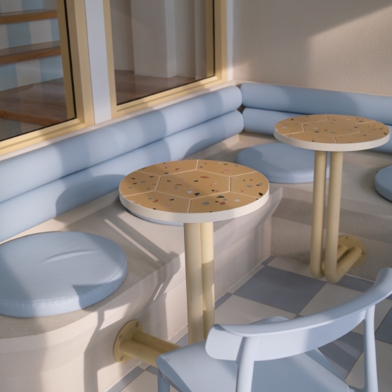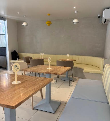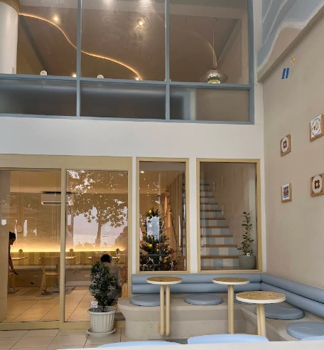 • ร้านตกแต่งสีพาสเทลเหลืองฟ้า โทนร้านสดใส
