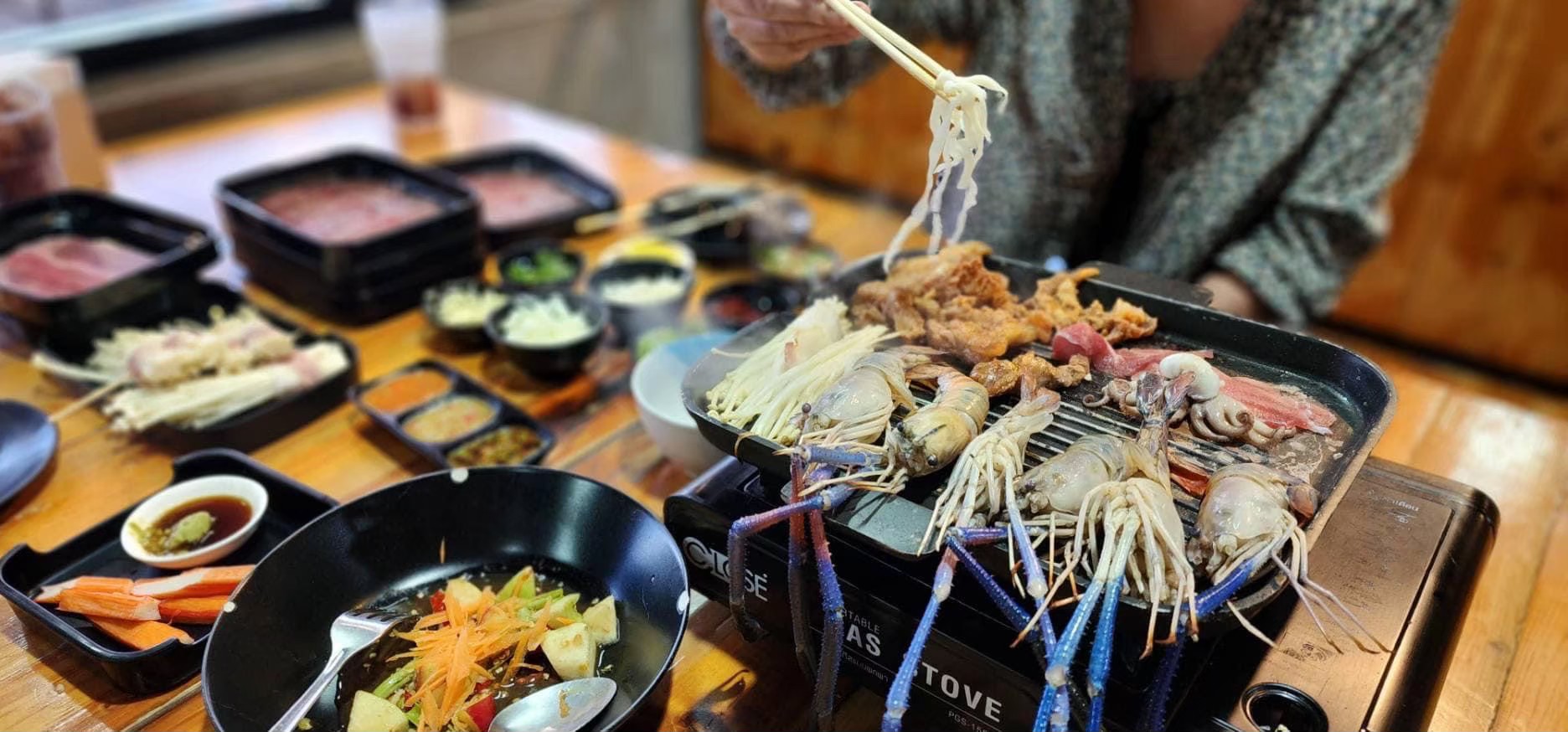 ร้านที่เน้นความคุ้มค่าและวัตถุดิบสดใหม่ทุกวัน หมูสามชั้นสไลซ์บาง ๆ เบคอนกรอบ ๆ ย่างแล้วจิ้มน้ำจิ้มซีฟู้ดคือดีมาก มีเมนูซีฟู้ดเสริมด้วย